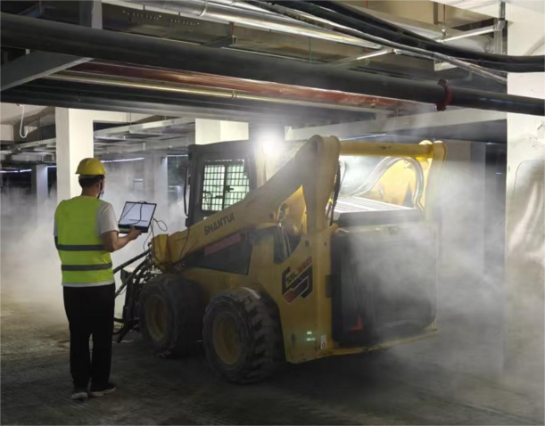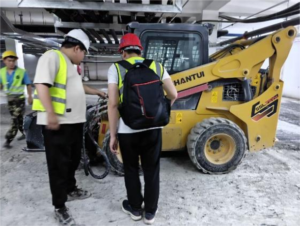 項目啟動后,山推技術(shù)團隊為客戶量身推薦了SSL75V-M滑移裝載機,配置快換銑刨鼓及清掃器等屬具。面對地庫內(nèi)2.1米的高度限制,SSL75V-M整機高度僅2065mm,轉(zhuǎn)向靈活,在狹小空間內(nèi)表現(xiàn)出色;配套的大流量屬具液壓系統(tǒng),保障了銑刨鼓的動力輸出,在硬質(zhì)水泥地面也能高效作業(yè),日均銑刨面積可達1000㎡,施工效率提升75%以上。